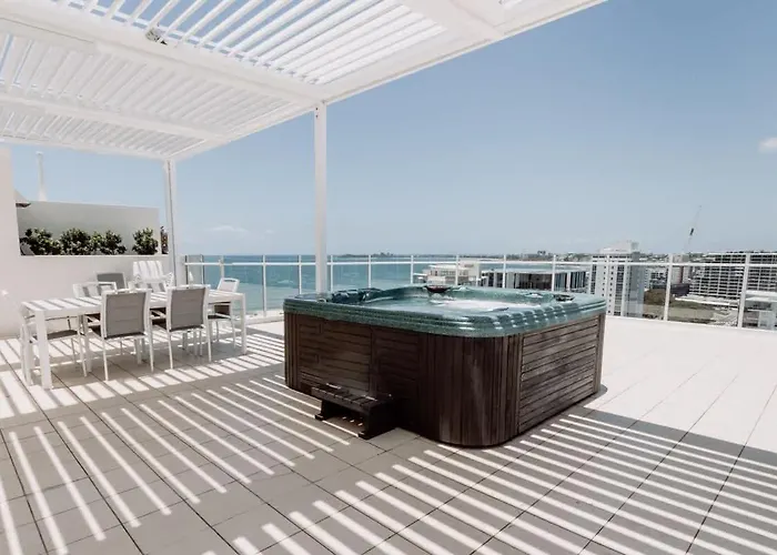 Disfruta de tus vacaciones en Maroochydore en el Apartamento Aquavista Penthouse - Stunning 180 Views Maroochydore. Ideal para quienes buscan una experiencia auténtica, está situado a una distancia de 4 km del Faro de Point Cartwright y a 20 minutos a pie del Centro Comercial Sunshine Plaza. El apartamento de 100 m² tiene un patio que ofrece vistas al mar.